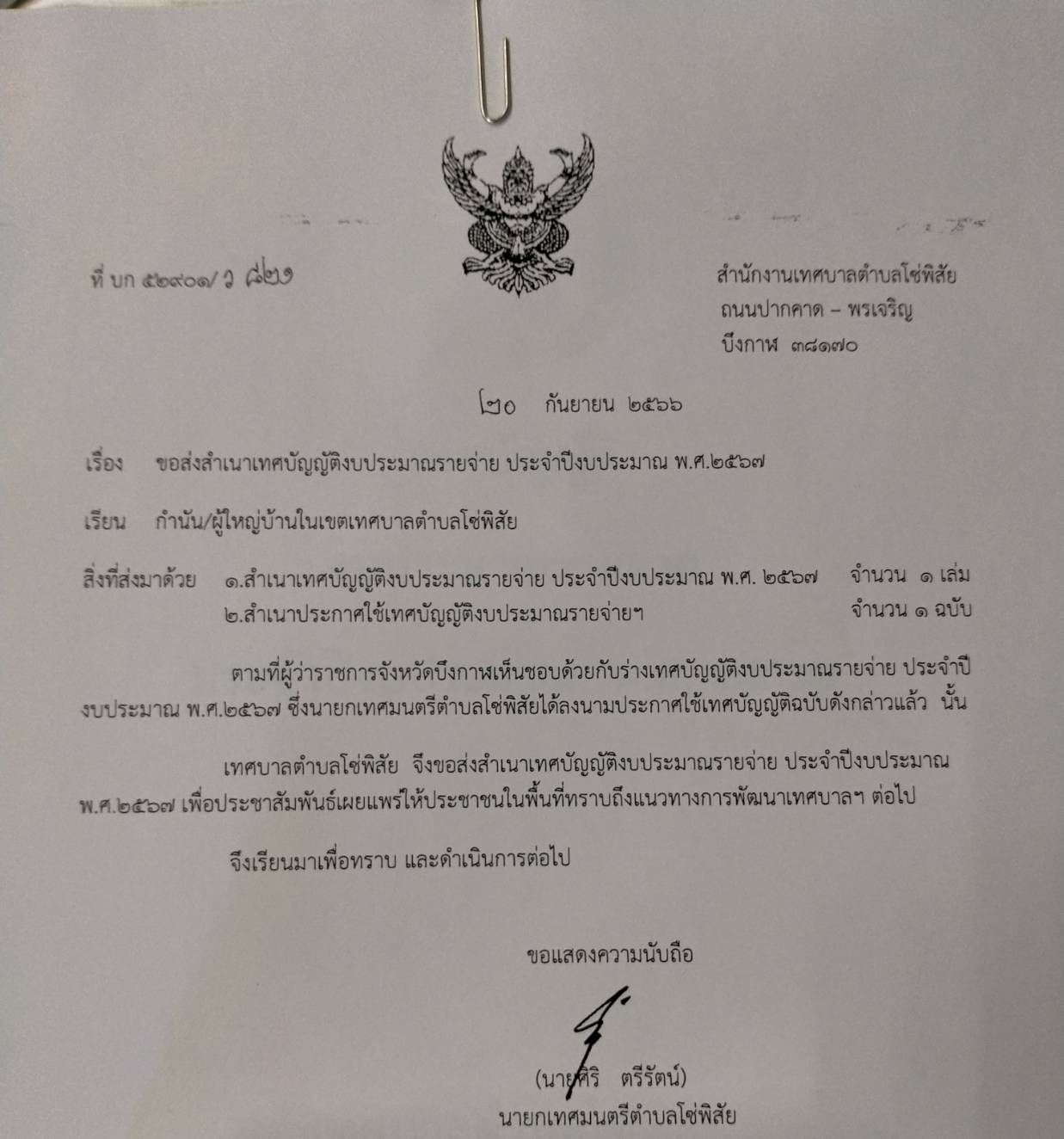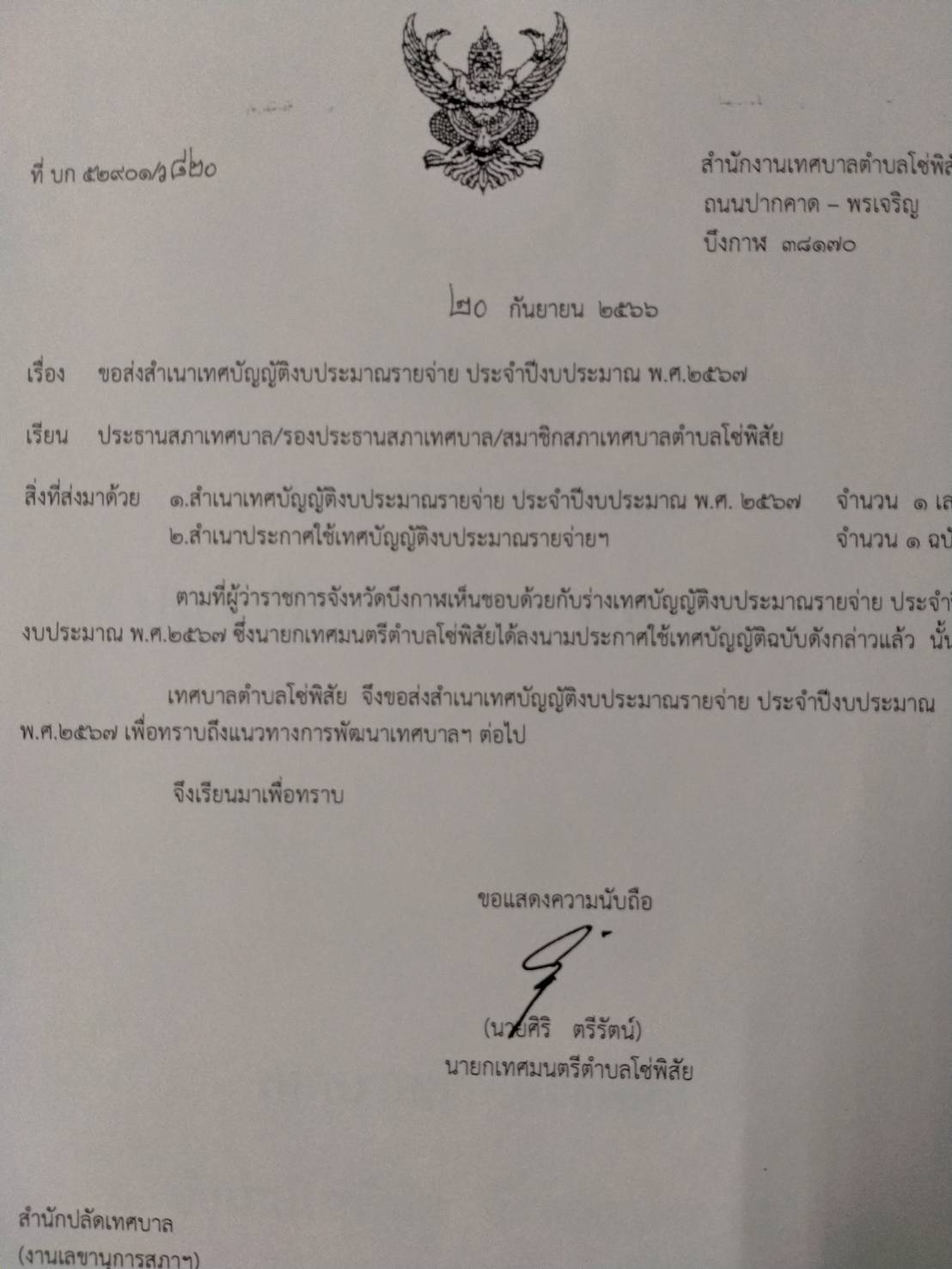 ประกาศใช้เทศบัญญัติงบประมาณรายจ่าย ประจำปีงบประมาณ 2567