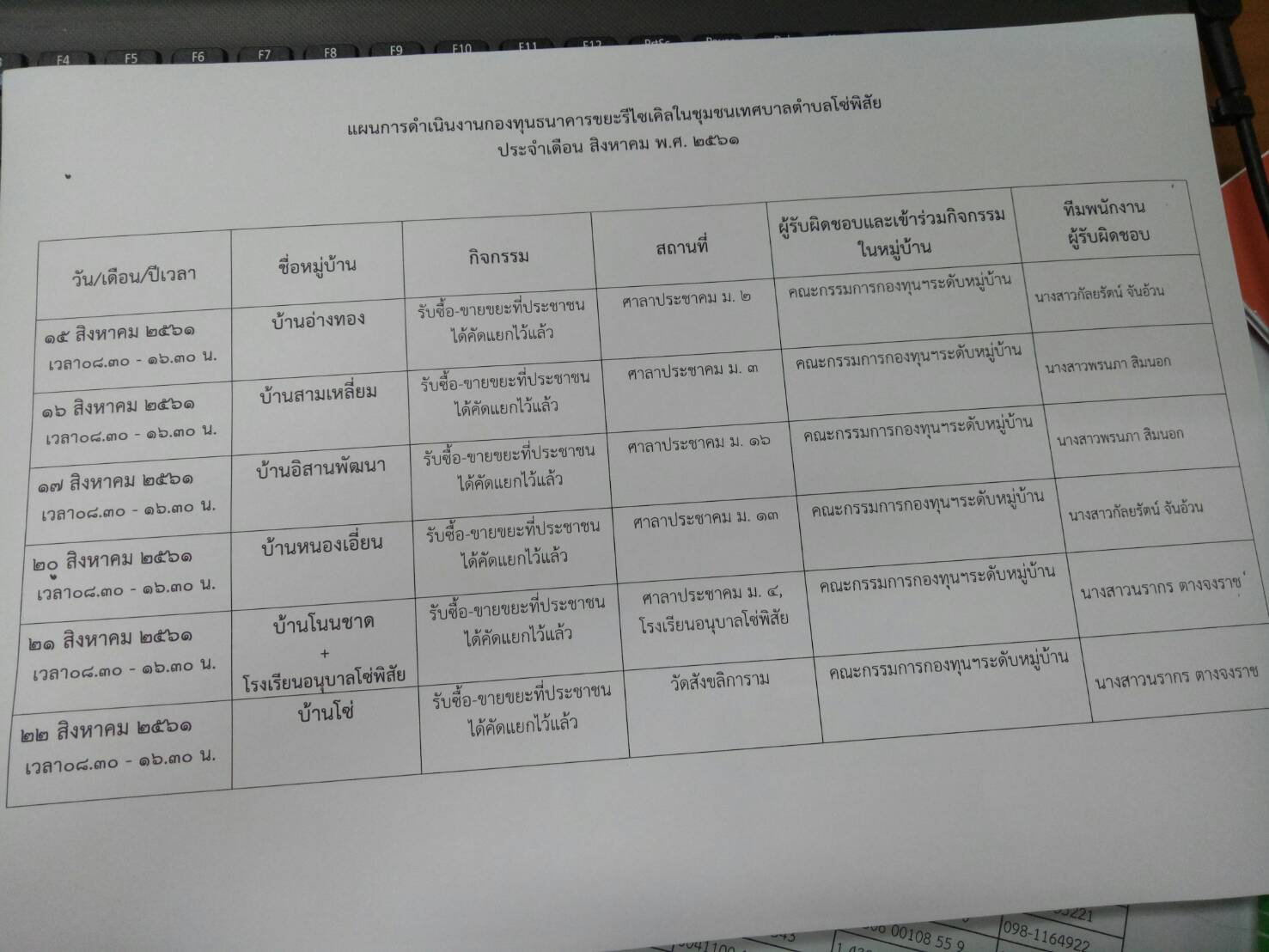 แผนการดำเนินงานกองทุนธนาคารขยะรีไซเคิลในชุมชนเทศบาลตำบลโซ่พิสัย ประจำเดือน สิงหาคม พ.ศ 2561